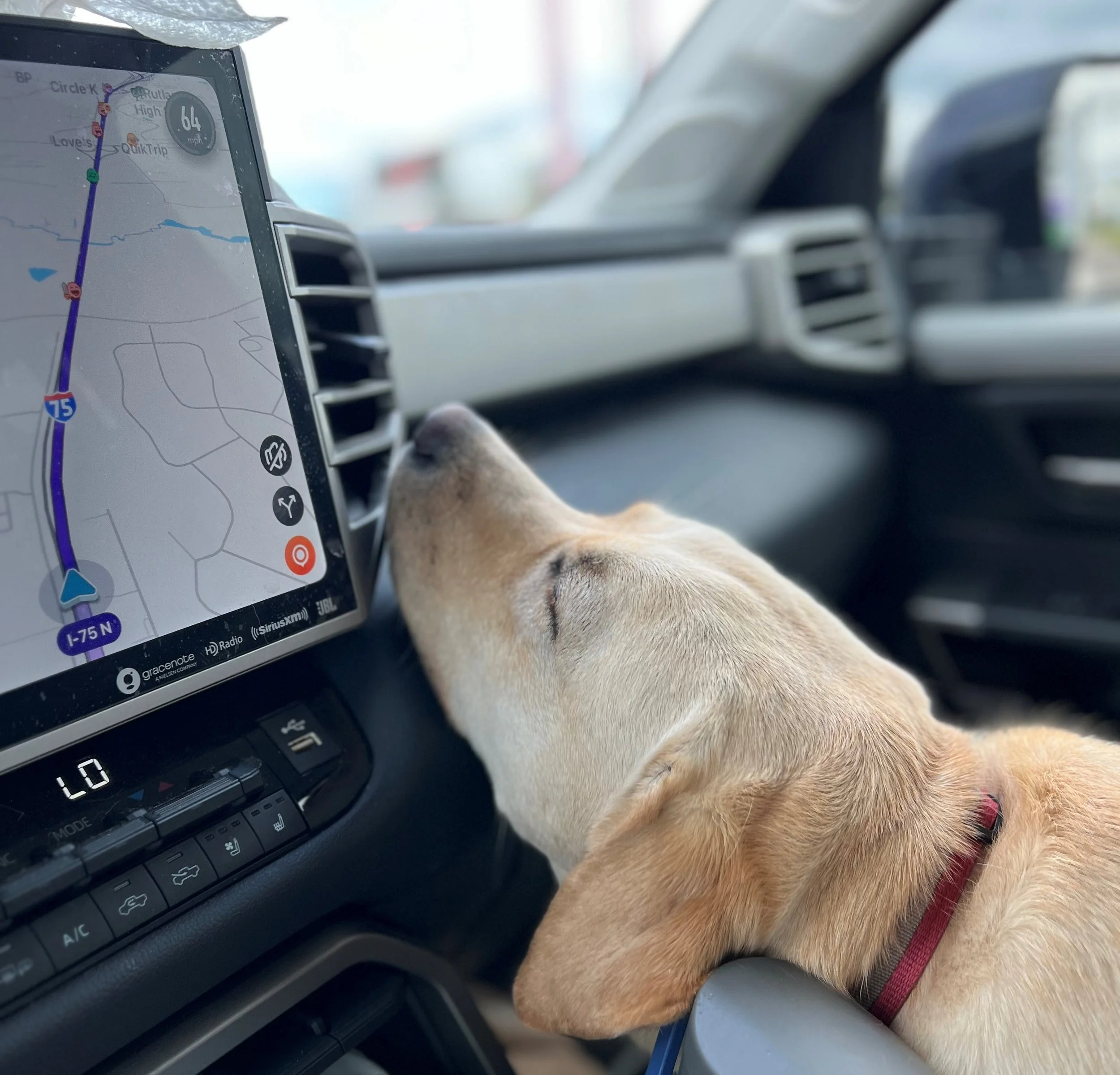 As we approached the solar eclipse, our travels took us from a serene lake in eastern Georgia to a historic plantation in Mississippi, and ultimately to Dallas for the eclipse event. Along the way, Echo, my ever-curious Labrador, has been my constant companion. She loves riding in the truck, finding comfort next to me as we traverse various states. Watching her snooze with her nose pressed against the air vent, breathing in the cool air, always brings a smile to my face—it's these little moments that make our journey so special.